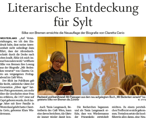 In der Sylter Rundschau vom 24. September 'rezensiert' Wiebke Stitz die Führung »Westerland – auf den Spuren des Dritten Reiches« die Silke von Bremen seit einigen Jahren mit großem Erfolg anbietet.