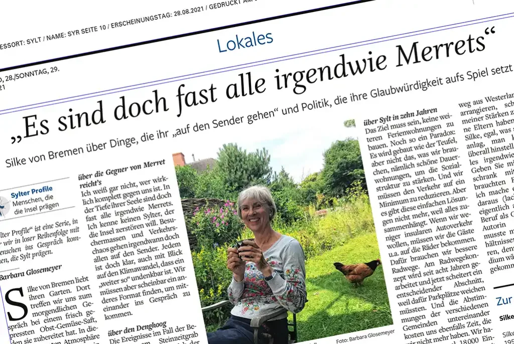 In der Reihe „Sylter Profile“ der Sylter Rundschau äußerte sich Silke v. Bremen in der Wochenendausgabe vom 28./29. August 2021 im Gespräch mit Barbara Glosemeyer zum aktuellen Diskurs über den Zustand der Insel, die Richtung, die verantwortliche Politik für Sylt verfolgen sollte, zur Initiative „Merret reicht’s“ und zu ganz persönlichen Themen.