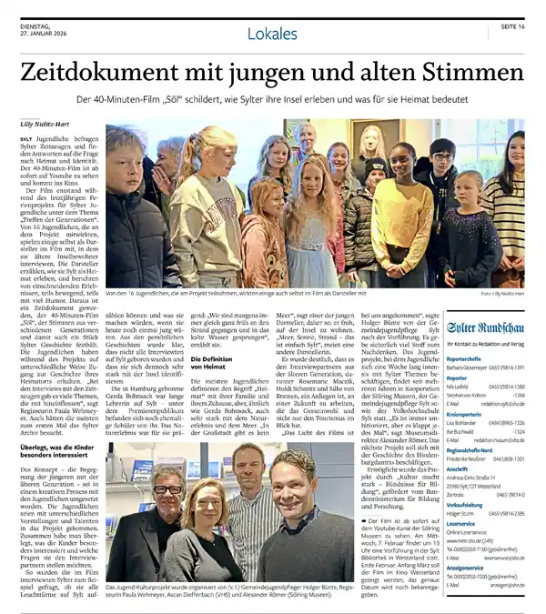 16 Sylter Jugendliche befragen ältere Mitbürger, die Sylt als ihre Heimat betrachten. Während die Jugendlichen von den spannenden Erinnerungen der Älteren erfuhren, bekamen diese mit, was die heutigen Kinder und Jugendliche bewegt und interessiert. Im Artikel der SHZ v. 27. Januar lesen Sie mehr. Hier als PDF.